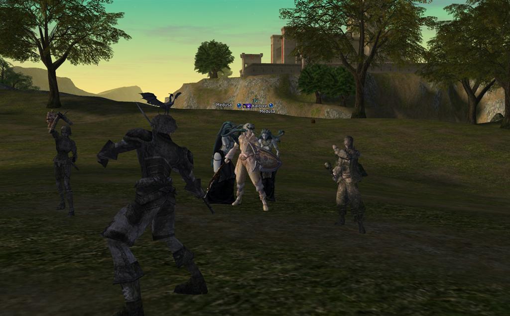 - Near the castle of Giran, the statues of three departed fighters stand amidst the frightful creatures that turned them to stone.
